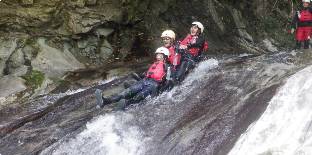 雄大な自然の中、清流に身をゆだねながらスリルと爽快感を味わえるのが「キャニオニング」です。岩肌を滑り降りたり、天然のウォータースライダーを滑走したり、透明度の高い水に飛び込んだり、まさに大自然を全身で感じるアクティビティ。